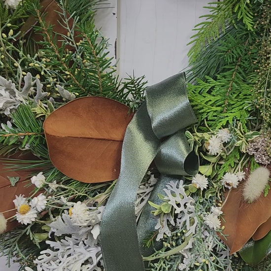 A mix of fresh greenery and dried flowers. This wreath has a mix of green, blue, white and silver in to give a little holiday and new year cheer.
